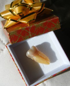 I was ready for an ordeal like with my previous extraction. He got started and then said, “It’s out.” I sat up and looked at him and said, “It’s out?” He picked up the forceps with my tooth clamped in them and said, “Yup. There it is. Do you want to keep it?” I thought about it for a moment and said, “Sure. Why not? I’ll put it under my pillow.” He smiled.