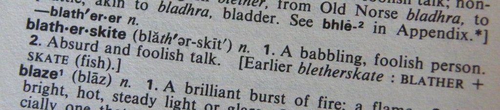 According to World Wide Words, blether is a Scots word meaning loquacious claptrap (oh my gosh, there’s another good word to investigate). Blether comes from the Old Norse blathra which means to talk nonsense. It is still around now in various other forms such as blather and blither.