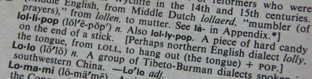 So then I wondered about lollipop. Don’t the British refer to a lollipop as simply lolly? And if lolly really does mean tongue, isn’t that just a little weird?