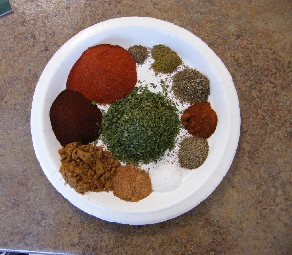 Starting at twelve o’clock with the smallest amount and moving clockwise you have: celery seed, ground oregano, basil, chipotle powder, ground black pepper, potassium chloride, coconut sugar, ground cumin, ancho chili powder, paprika and in the center, dried parsley flakes.