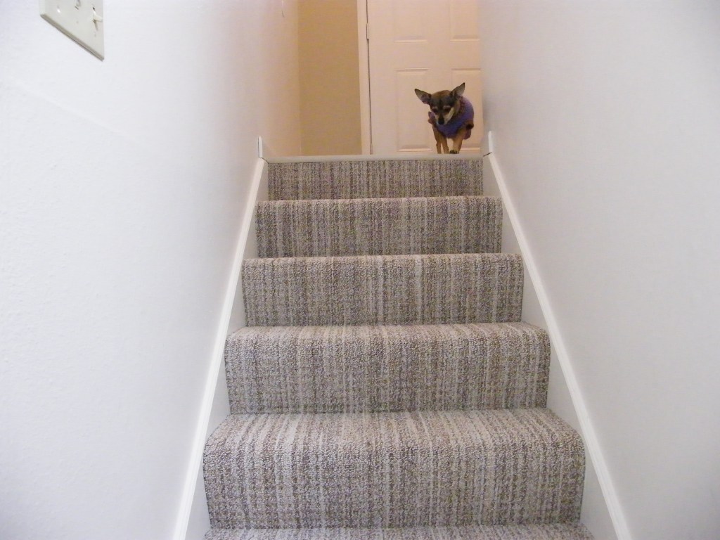 This is looking up the stairs from the lower level to the foyer. Maddie is happy we carpeted them. The rest of the house is all laminate flooring. I hate carpet. No way to really keep it clean.