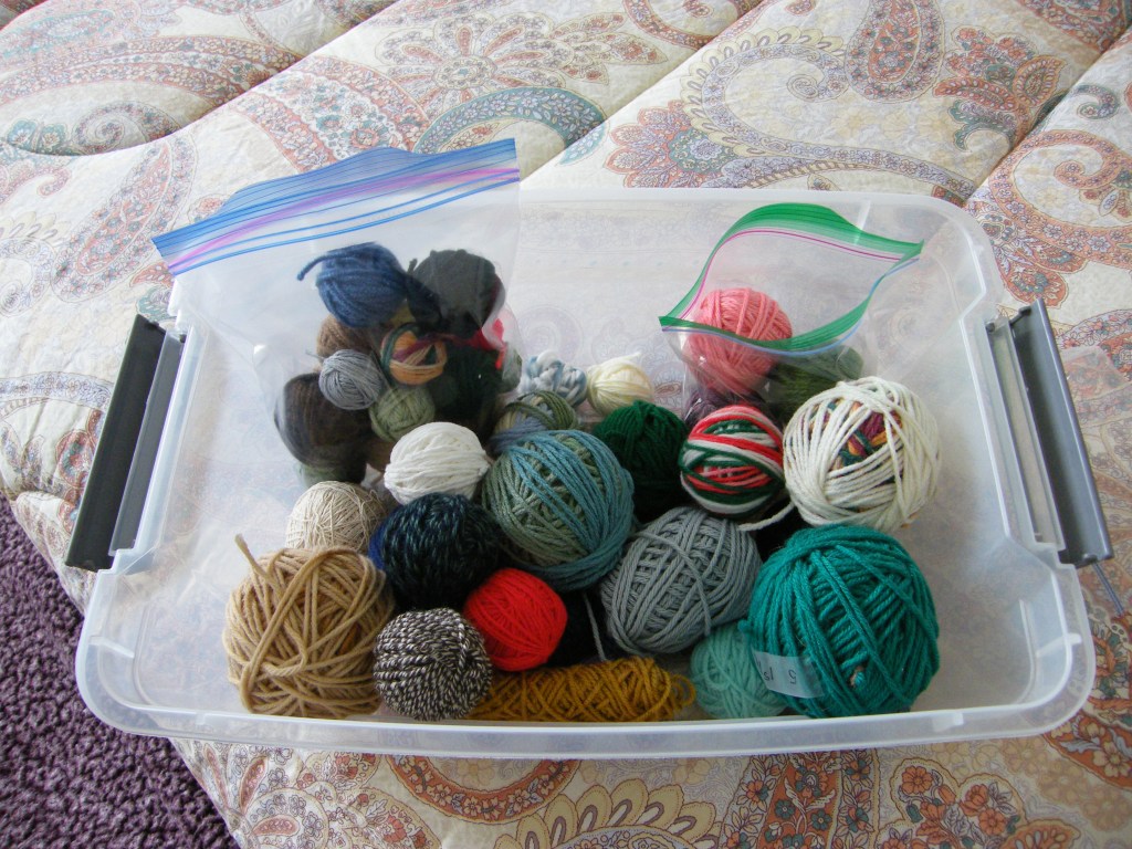 If the skein remnants are large enough, I leave them as they are. If they are small, I make them into balls. Some of the balls are ridiculously small. Up until recently, I’ve kept them anyway. Last week, I threw a bunch of them away. Still can’t believe I did that.