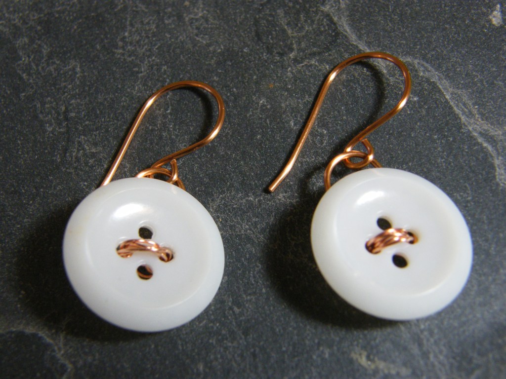 These are milk glass. The first earrings I made. Later, I realized I should have worked the wire through all four holes. Based on how the red buttons above smell when warmed, I suspect they are Bakelite.