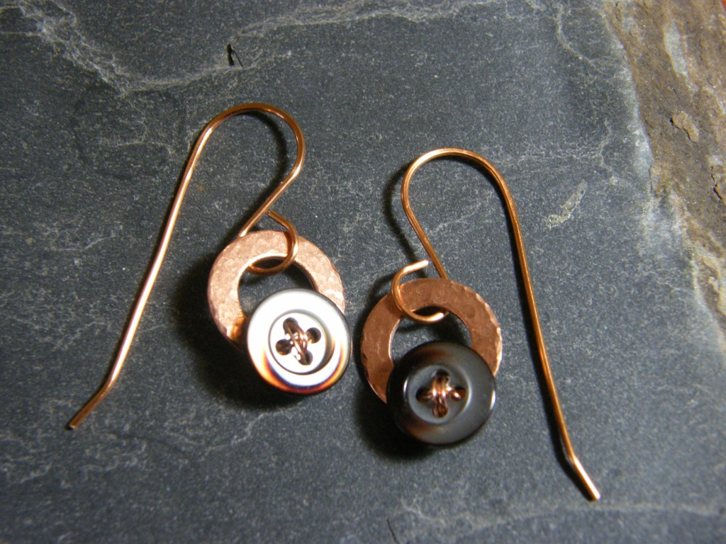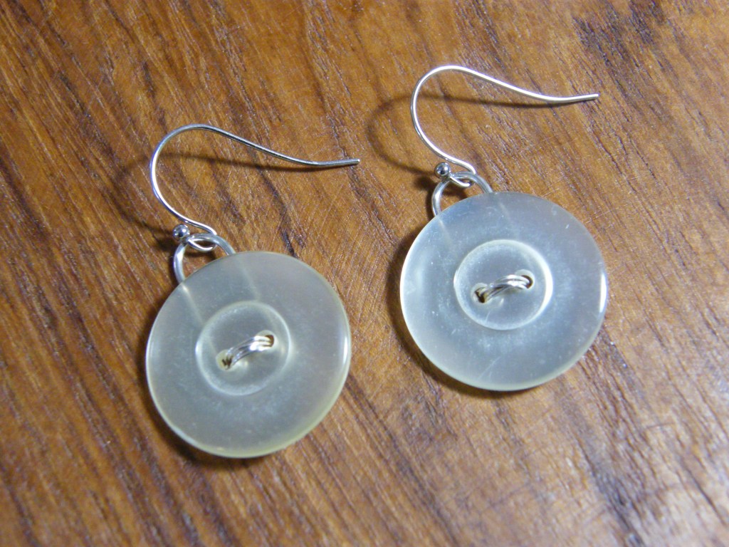 There are plastic buttons and glass ones. There are a lot of mother of pearl buttons (these are mostly shank buttons and I haven’t yet figured out how to make that kind into earrings) and a few wooden ones. I suspect a couple of them are Bakelite. There are metal buttons as well. Some have two holes and some have four. There are quite a few shank style buttons.
