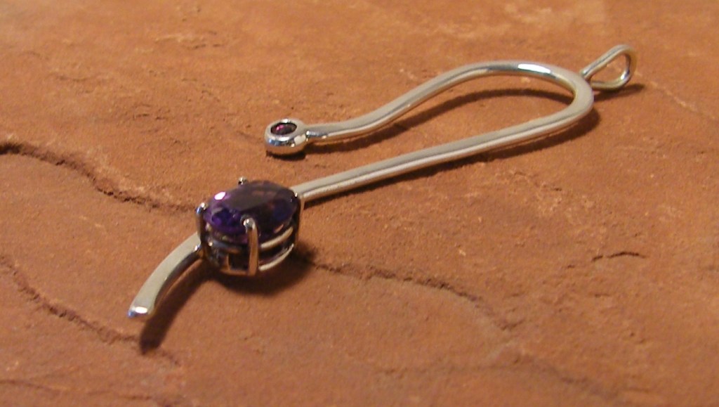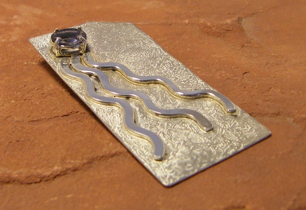 This pendant combines his first ZenJem design (three wavy lines) with a more traditional back plate kind of mounting. The gemstone in this case is a 0.85 carat faceted iolite.
